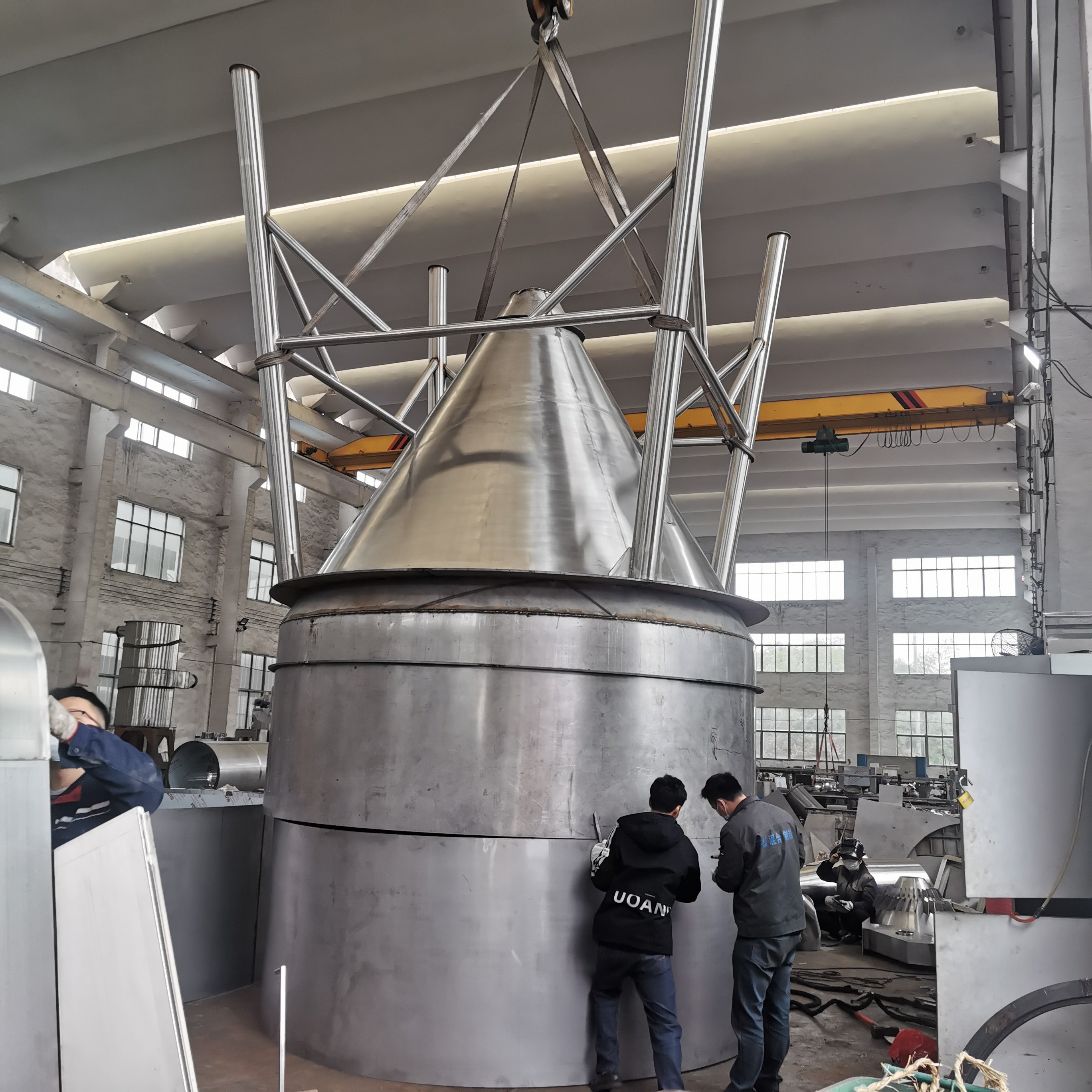 El aire se filtra y se calienta en el distribuidor superior del aire del secador, y el aire caliente incorpora la cámara de sequía uniformemente en una moda espiral. El líquido material se rocía en una gotita líquida finalmente atomizada a través del nebulizador centrífugo de alta velocidad en la cima del cuerpo de la torre, y se puede entrar en contacto con con el aire caliente en un mismo breve periodo de tiempo y se puede secar en productos finales. El producto final se descarga continuamente de la parte inferior de la probeta de desecar gases y del ciclón, y el gas de escape es drenado por la fan del proyecto.